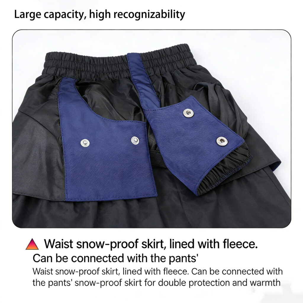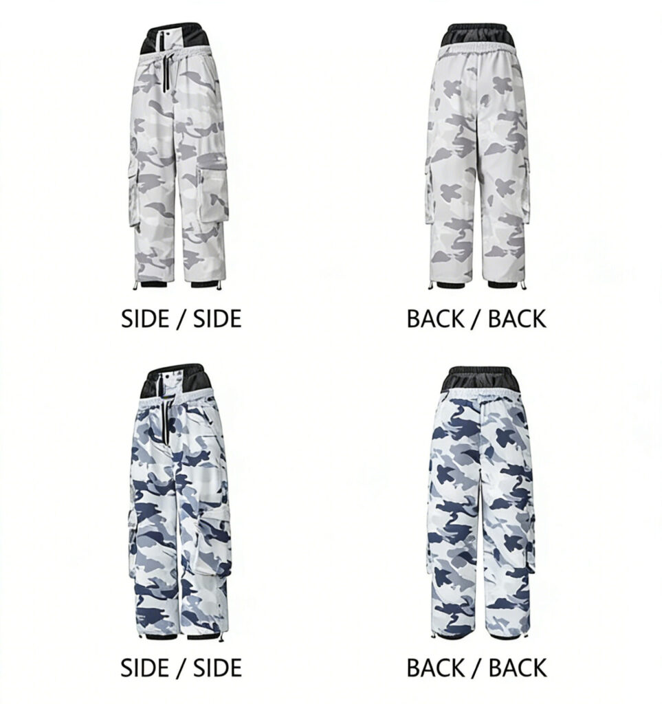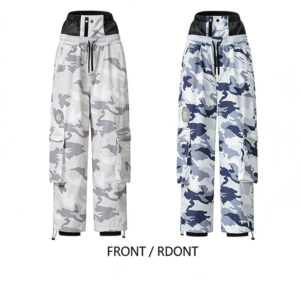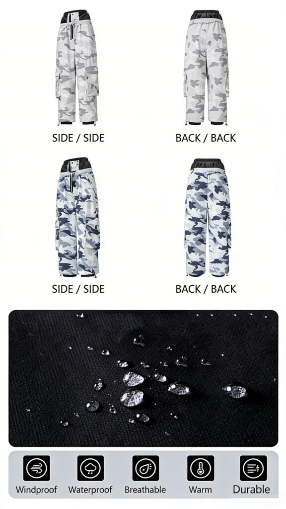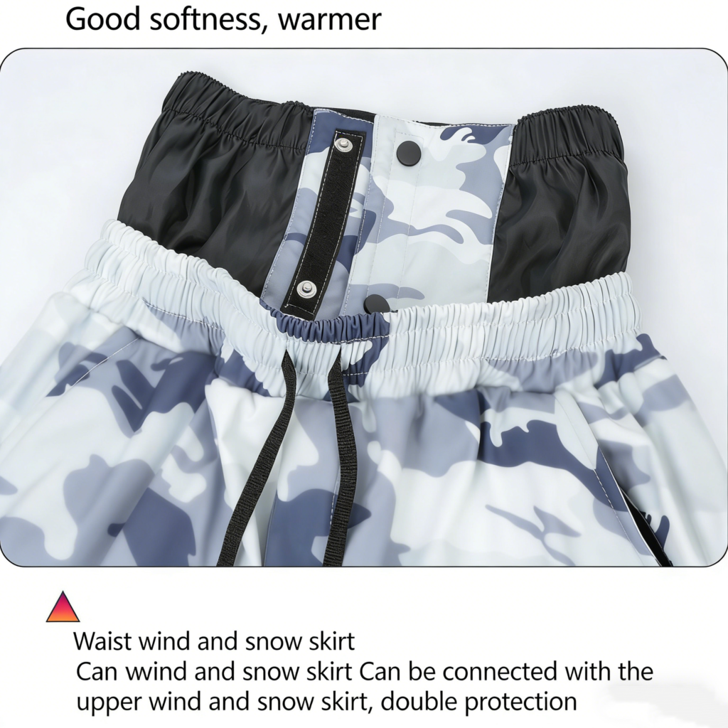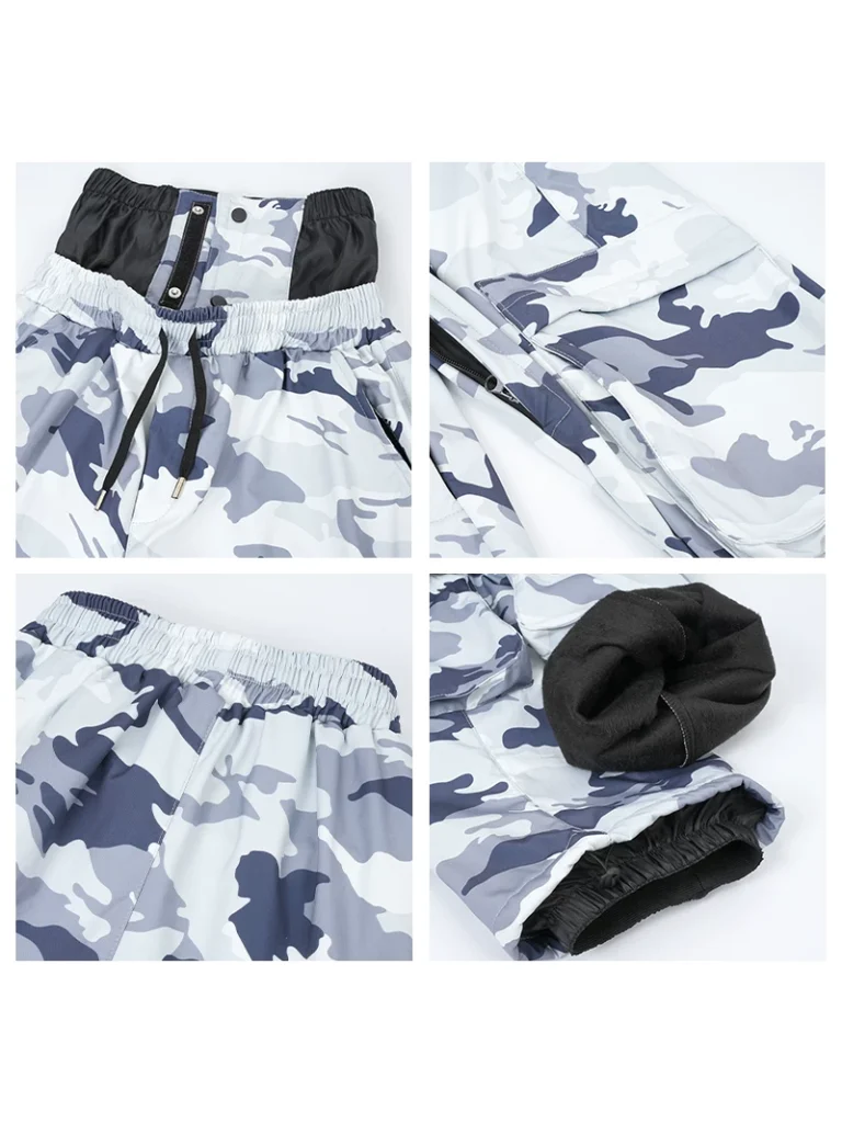 These men’s camouflage ski pants are meticulously designed to strike a balance between flexibility, protection, and modern style. Crafted from durable 100% nylon Taslon fabric, they feature a DWR (C0) water-repellent finish and a milky TPU membrane layer, delivering exceptional waterproof and breathable performance.