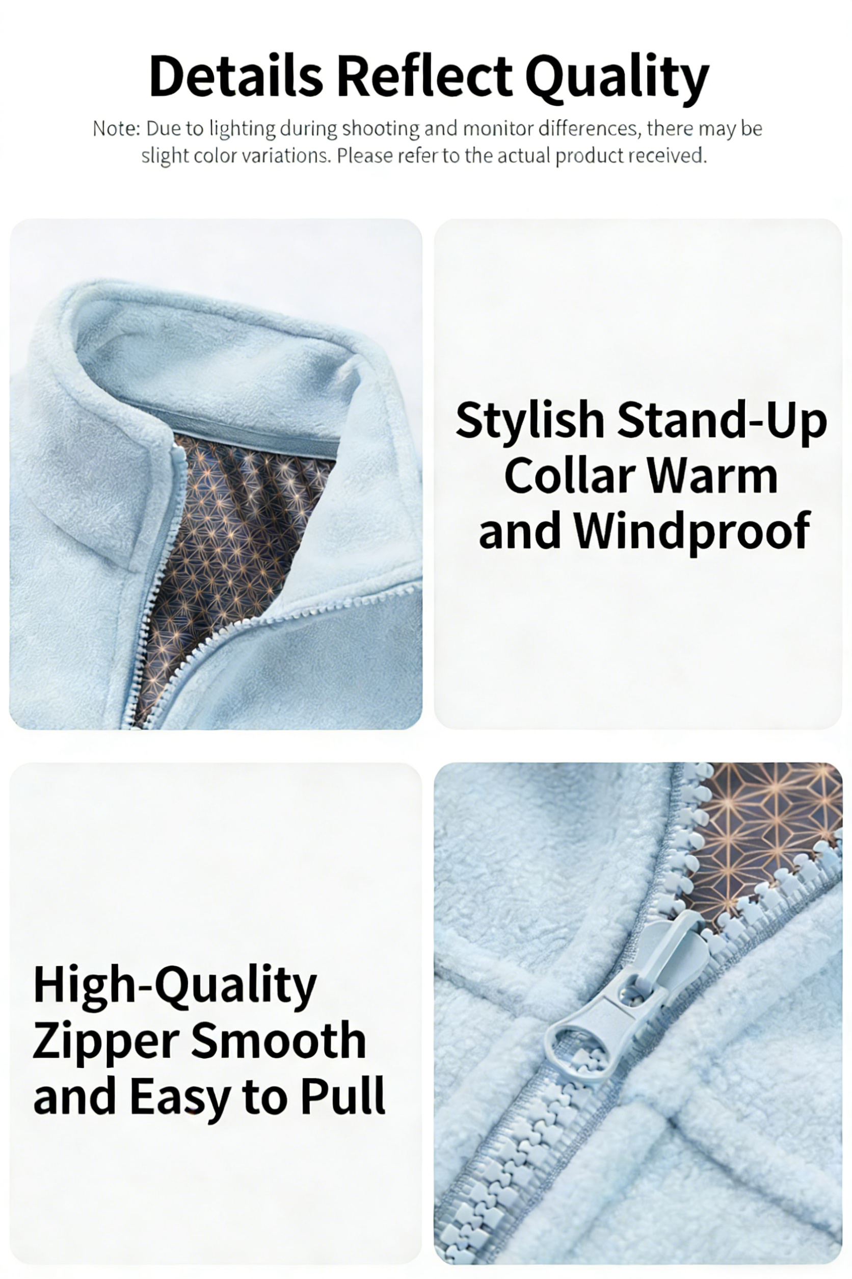 Hood:Grown on hood, with elastic string and stopper in hood opening